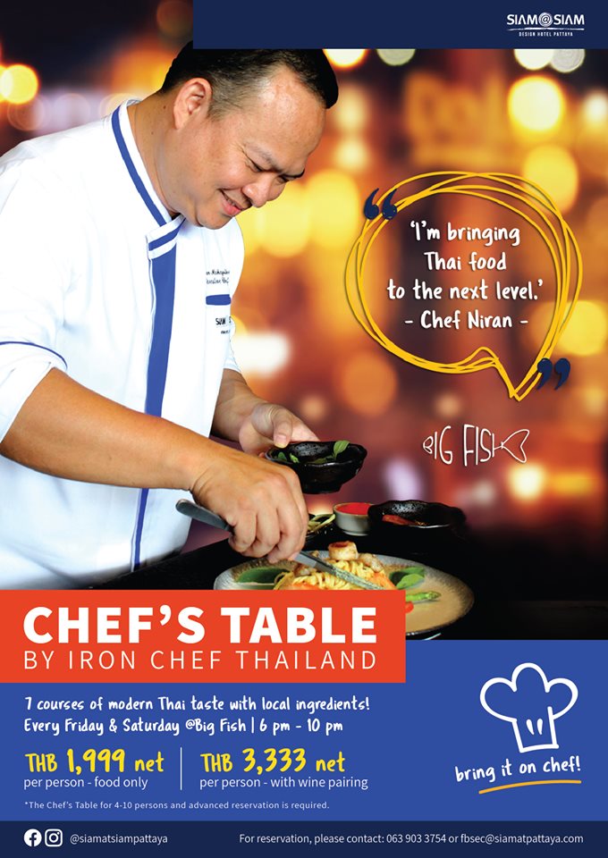 มาฟินกับประสบการณ์สุดพิเศษตามใจเชฟ ดีกรีเชฟกระทะเหล็ก ‘เชฟนิรันดร์’ ที่จะมารังสรรค์อาหารจานพิเศษจากวัตถุดิบท้องถิ่นคุณภาพดี พร้อมชมกระบวนการทำอาหารของเชฟทุกขั้นตอน กับ Chef’s Table ทุกวันศุกร์และวันเสาร์ ที่ Big Fish