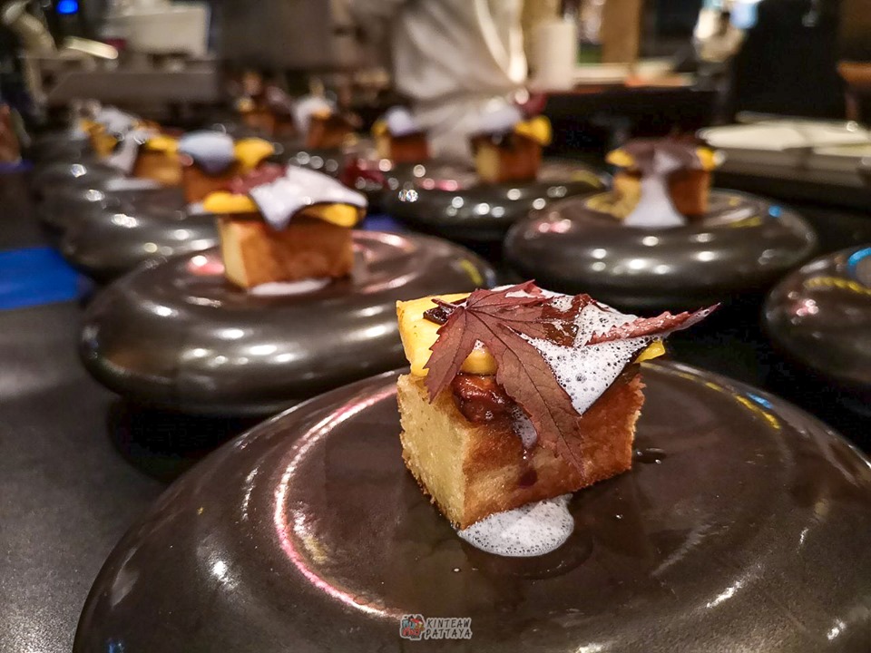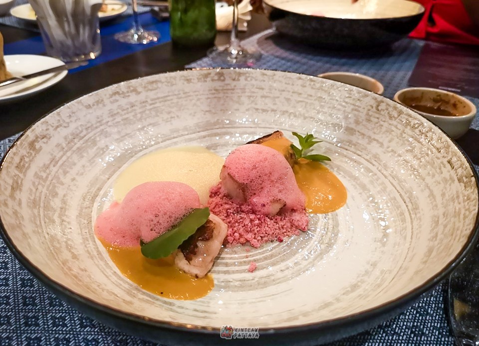 - จานที่5 เนื้อปลาหิมะและเนื้อปลาตาเดียว เสริฟมาพร้อมกับซ๊อสไข่เค็มและราดด้วยโฟมที่ทำมาจากน้ำมะนาวโห่