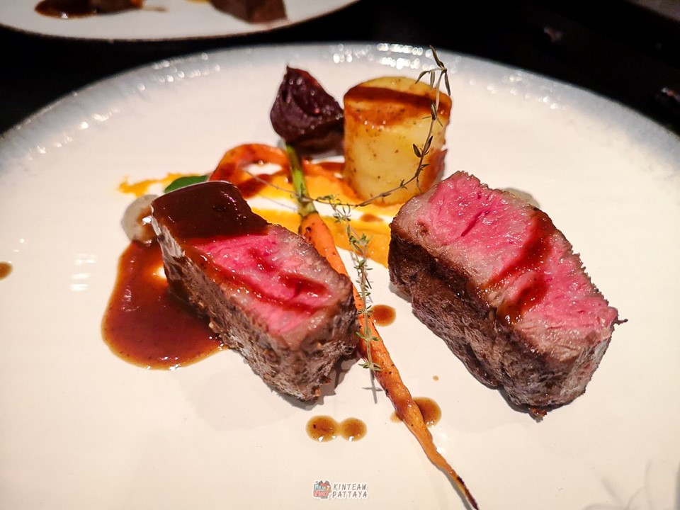 - จานที่6 เนื้อวากิวA5 ราดซ๊อสไวน์แดง เสิรฟพร้อมแครอทบดและเห็ดรวมพูเร่