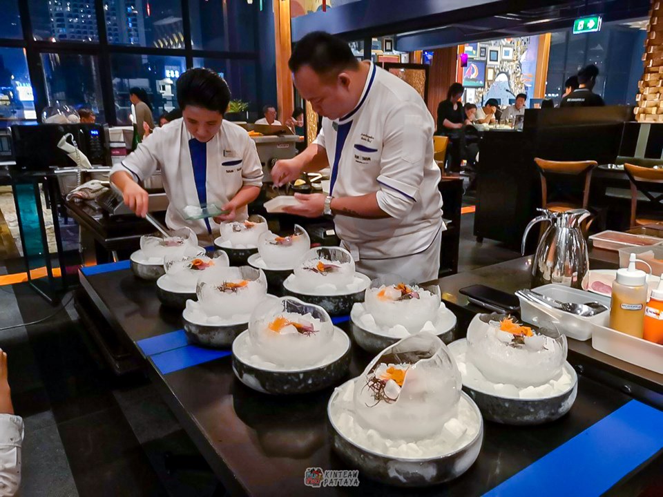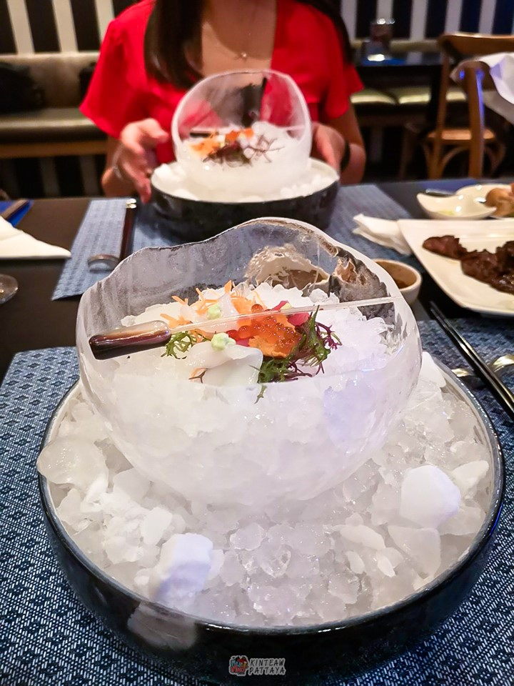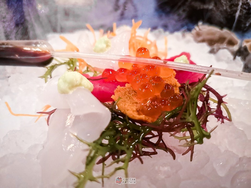 - จานที่4 อลังการมากกกก เป็นซาชิมิอาหารทะเลสด(ปลาทูน่า ปลาหมึก ไข่เม่นและไข่ปลาแซลมอล) เสิรฟมาบนน้ำแข็ง พร้อมกับสาหร่าย3สี