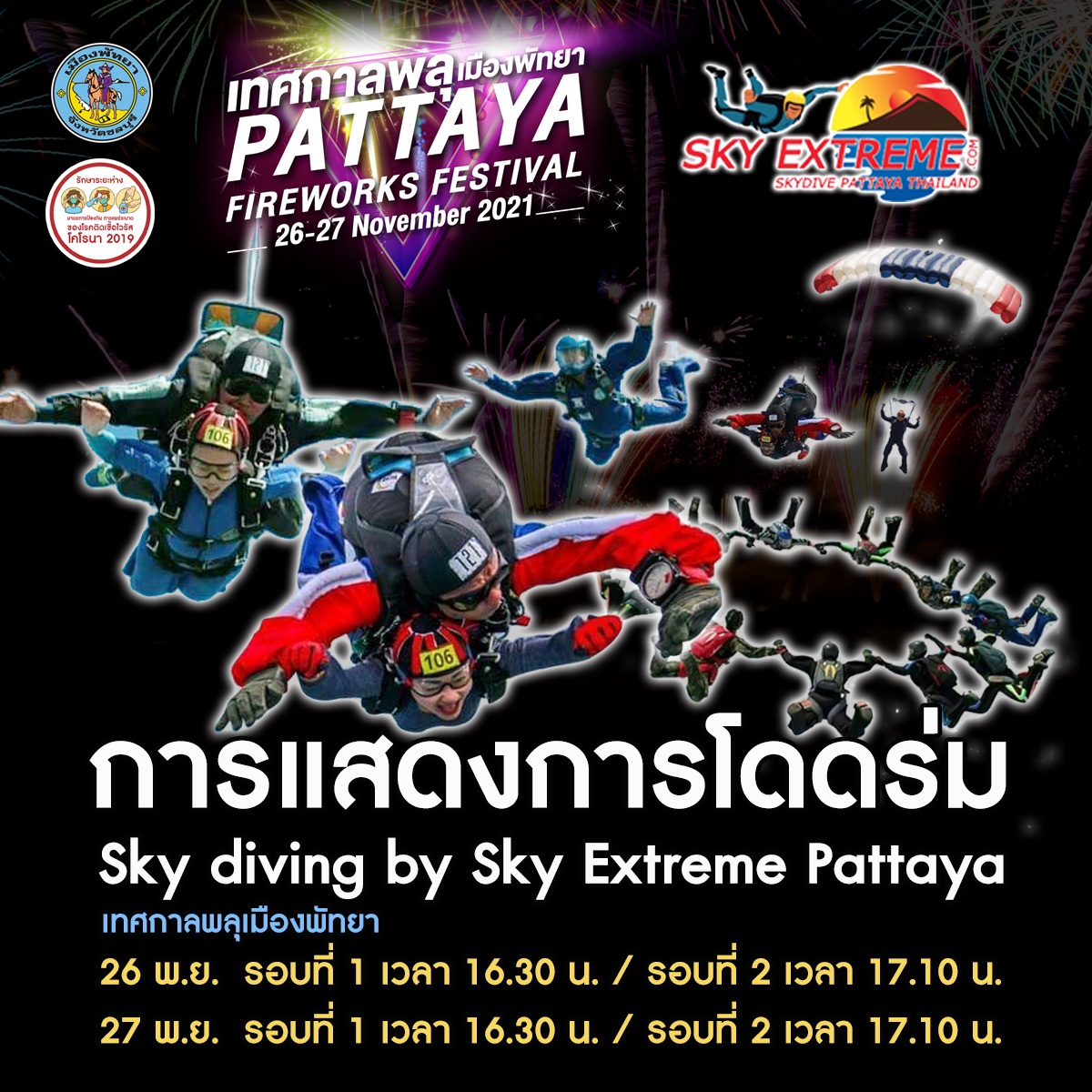 เวลา 16.30 น. การแสดงการโดดร่ม รอบที่ 1 Sky diving by Sky Extreme Pattaya