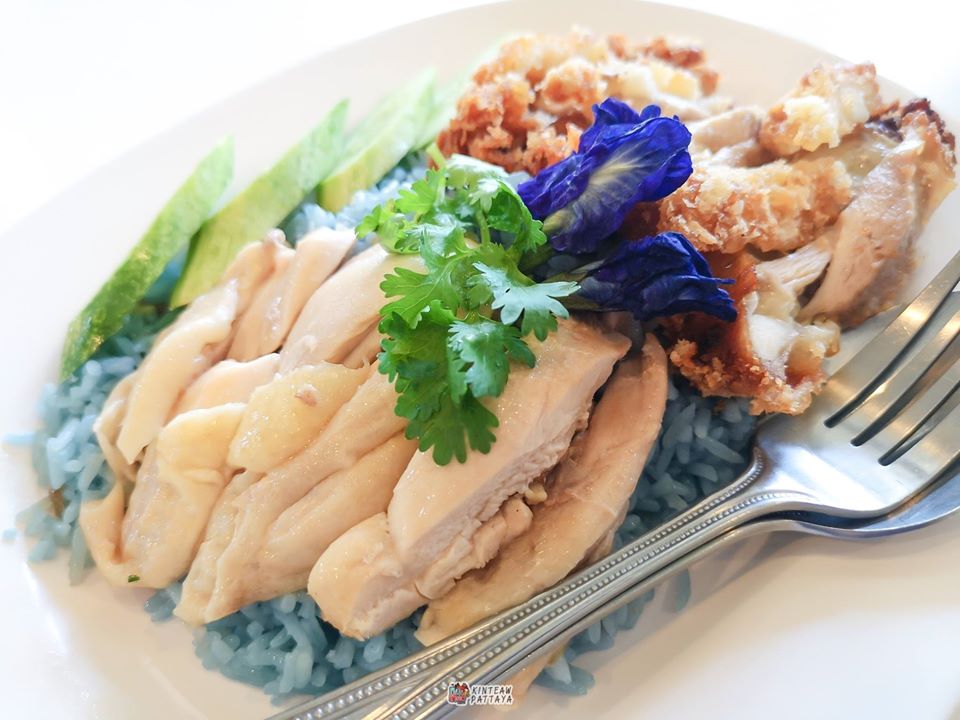•ข้าวมันไก่ดอกอัญชัน ข้าวหอม ไก่นุ่ม น้ำจิ้มรสเด็ด