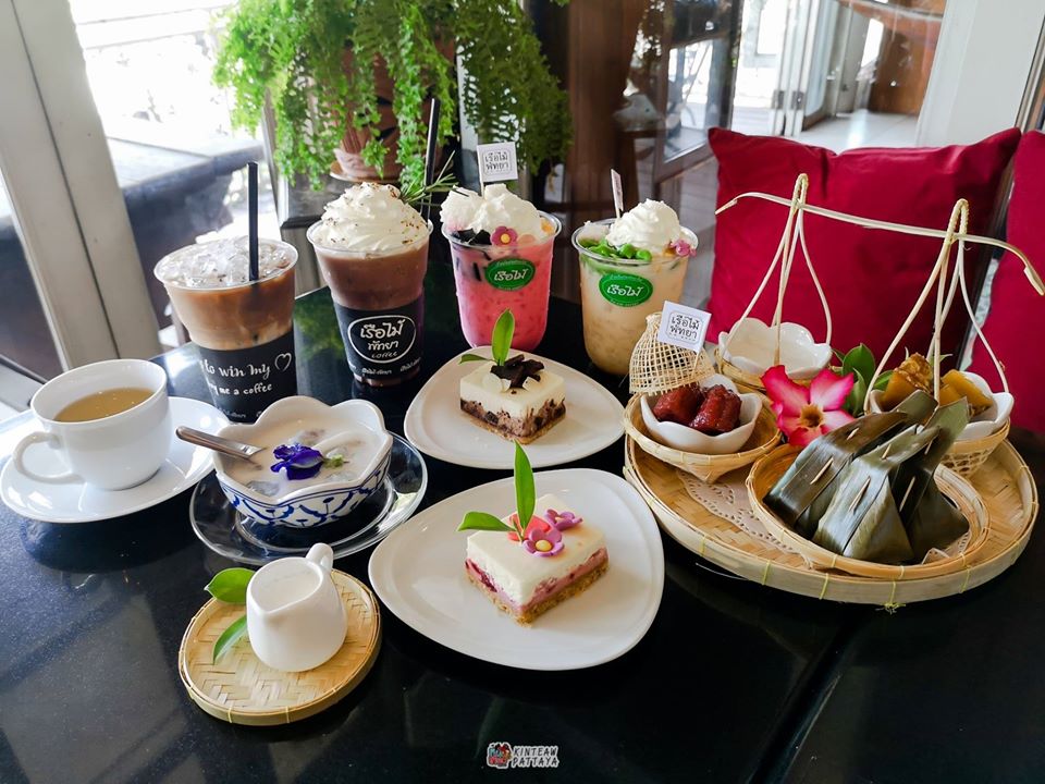 🍰มาดูทางของหวานบ้าง ☕มีกาแฟเรือไม้หลากหลายเมนู ชาร้อนๆจากอังกฤษ เสริฟคู่ขนมไทย เป็นชุด Afternoon Tea เพียง 150 บาท และก็มีเค้กต่างๆ ราคาไม่แพง รวมถึงไอศครีม