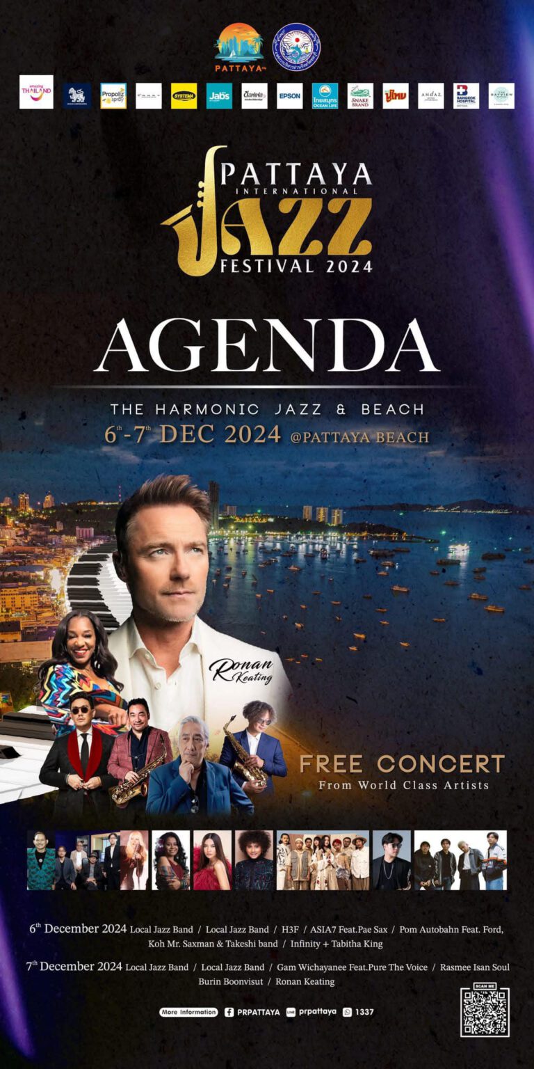 ศุกร์ที่ 6 และ เสาร์ที่ 7 ธันวาคมนี้ ชิลๆริมหาดกันต่อกับ Ronan Keating , บุรินทร์ บุญวิสุทธิ์ , ฟอร์ด สบชัย , ป้อม ออโต้บาห์น , โก้ มิสเตอร์แซ็กแมน , แก้ม วิชญานี , เพียว เดอะว๊อยซ์ และศิลปินแจ๊สอีกมากมาย ใน Pattaya International Jazz Festival 2024 ที่ชายหาดพัทยากลาง